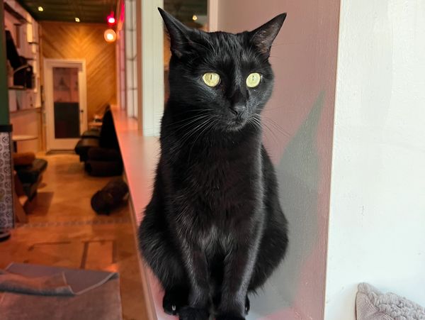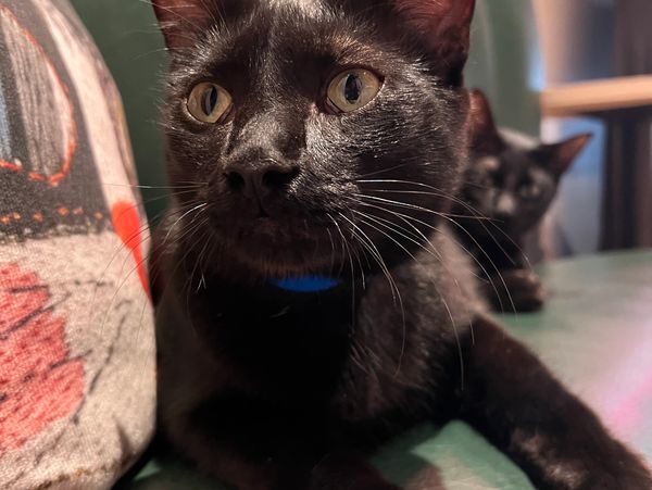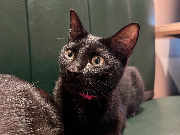 1-year-old female, all black with beautiful eyes. A little shy and still settling into the lounge, often found relaxing in the brown tunnel. Very sweet once she warms up. Bonded with her twin brother, Fredrico.