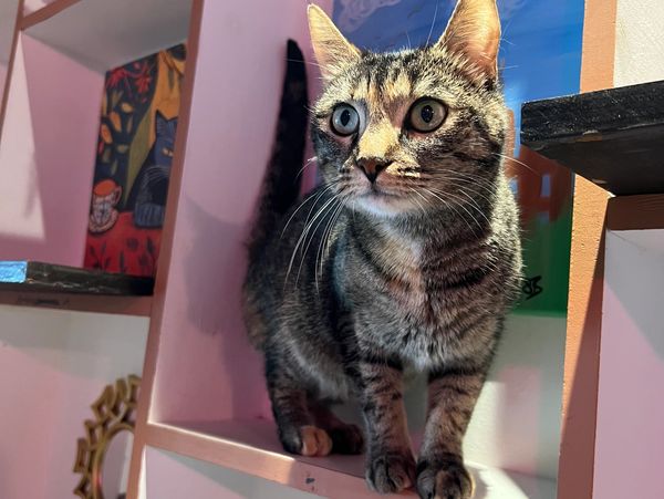 1-year-old tabby. Loves other cats and has a bit of sass in her. Full of personality and playfulness.