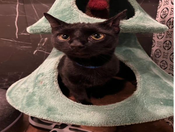 4-year-old all-black male. Loves to play, give gentle love bites, and hang out up high. Great with other cats. Very affectionate and social. ADOPTABLE THROUGH SOCKS